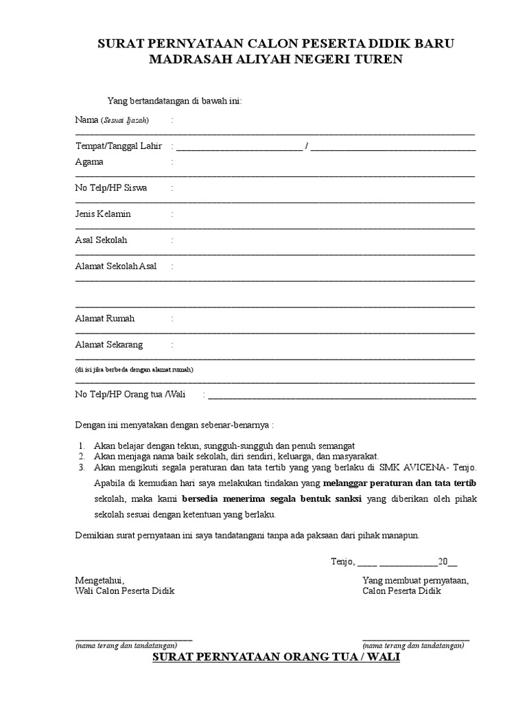 Surat pernyataan persetujuan orang tua untuk pendaftaran sekolah. Kurang lebih contoh surat pernyataan untuk kerja tersebut seperti berikut ini. | contoh surat perjanjian orang tua/wali murid dengan sekolah.