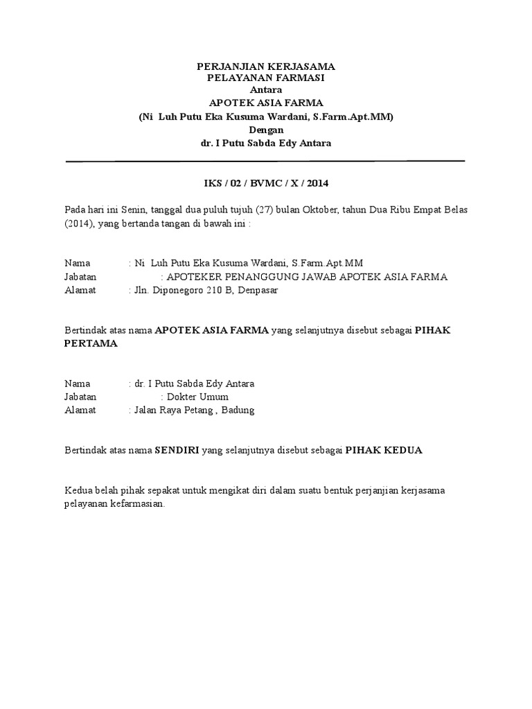 081350088401 pegawai (asisten apoteker) nama : Di beberapa artikel sebelumnya kami membahas berbagai jenis surat perjanjian. Adapun contoh surat perjanjian kerjasama kemitraan bisnis atau usaha tersebut ialah sebagai berikut.