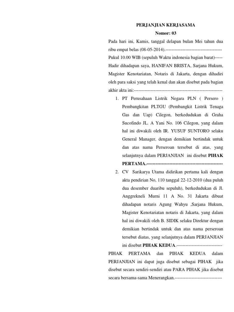 Gala putra mandiri sesuai akta notaris ellen rumambi, sh, m.kn yang berkududukan di perumahan nusa tamalanrea indah blok dd no. 592 tahun 2010 2.2.3 berhak melakukan kerjasama dengan pihak ketiga dalam pelaksanaan usaha penambangan sesuai. Surat perjanjian kerjasama atau memorandum of understanding (mou) ini dalam dunia bisnis sering dijadikan sebagai dokumen penjelasan mengenai suatu proyek yang dilakukan bersama. Perjanjian kerjasama pembiayaan modal kerja.