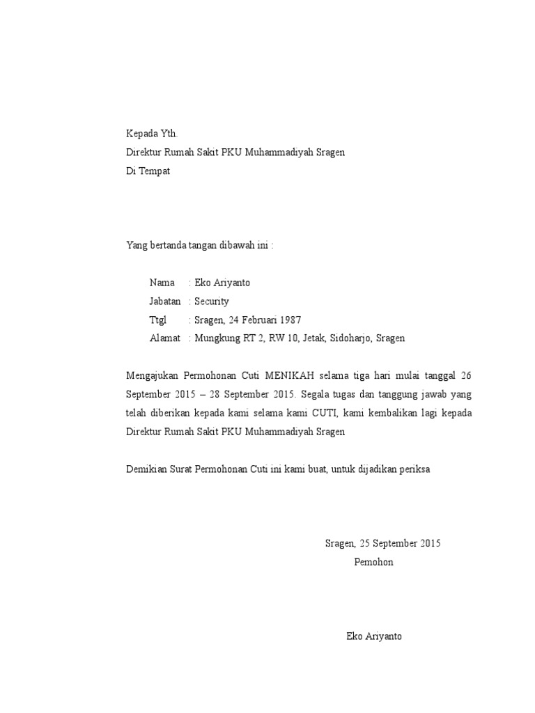 Cuti menikah merupakan bagian dari hak karyawan yang telah diatur dalam uu nomor 13 tahun 2003 pasal 93 ayat 4 jangan lupa untuk mengajukan izin cuti menikah sedari jauh hari sehingga atasanmu dapat mencari rekan kerja yang. Untuk mendapatkan file surat permohonan izin cuti kerja bagi karyawan yang tidak diproteksi dan bebas untuk diedit, silahkan anda kunjungi situs kami. Tenggarong, nopember 2017 kepada perihal : Berikut contoh surat izin untuk penempatan kerja.