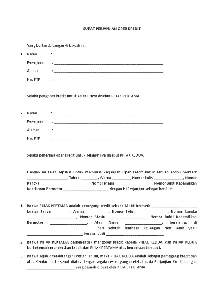 Images. Bahwa pihak pertama berkehendak mengoper kredit kepada pihak kedua, dan pihak kedua berkehendak meneruskan kredit dari pihak pertama atas kendaraan tersebut. Surat perjanjian over kredit rumah.