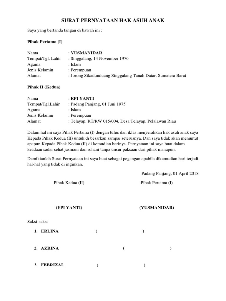 Hak asuh anak menurut syariat islam. Yang merupakan ibu kandung dari anak bernama bagas putra prakoso dengan surat ini menyerahkan hak wali asuh kepada sepasang suami istri Surat pernyataan ini merupakan bukti pengalihan hak asuh anakoleh (nama ibu) kepada (nama paman).