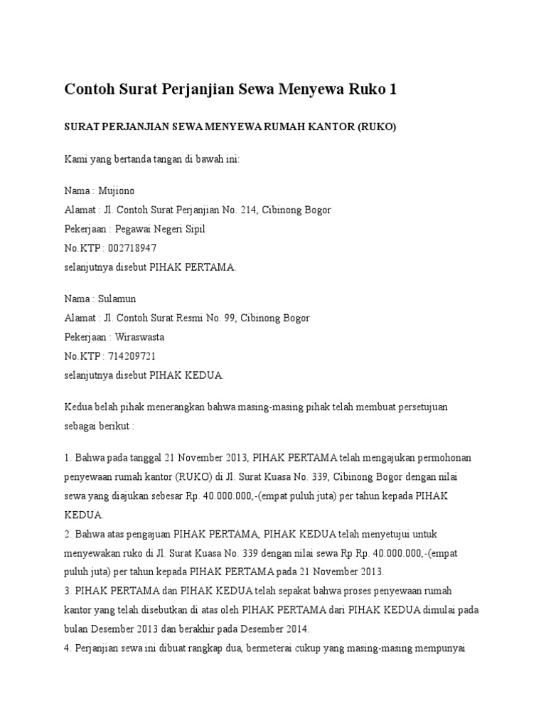 Contoh surat perjanjian sewa rumah. Surat perjanjian sewa beli (angsuran); Selanjutnya ialah persetujuan yang dilakukan antara pihak penyewa dengan pihak yang telah menyewakan. Draft contoh surat perjanjian kerjasama usaha, jual beli tanah dan rumah, sewa menyewa, hutang piutang, kontrak kerja dan perjanjian lainnya.