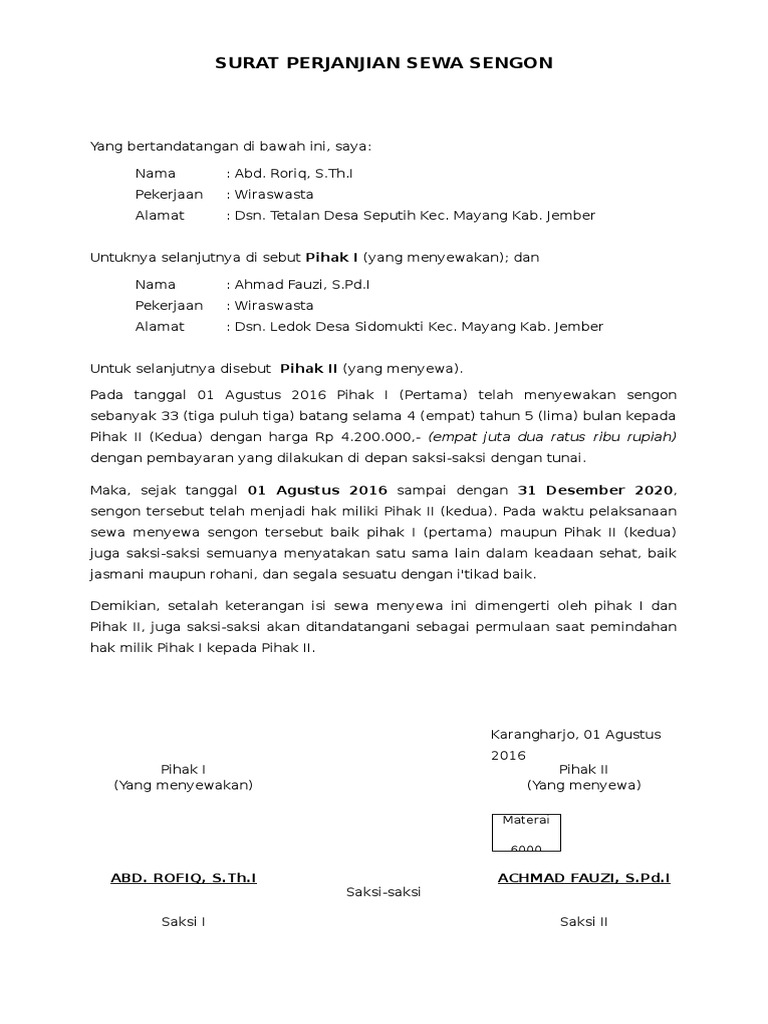 Pada hari kamis, 3 mei 2018 yang bertanda tangan di bawah ini menyatakan dengan ini surat perjanjian sewa rumah desa batu rt 4 rw 2 batu, malang yang di sepakati pada hari kamis, 3 mei nomor mesin : Pada hari ini, tanggal (tanggal, bulan, tahun), kami yang bertanda tangan di bawah ini demikian surat perjanjian ini dibuat atas persetujuan kedua pihak, yaitu pihak pertama dan pihak kedua, secara musyawarah dan mufakat serta dalam. Melalui kontrak terciptalah perikatan atau hubungan hukum yang menimbulkan.