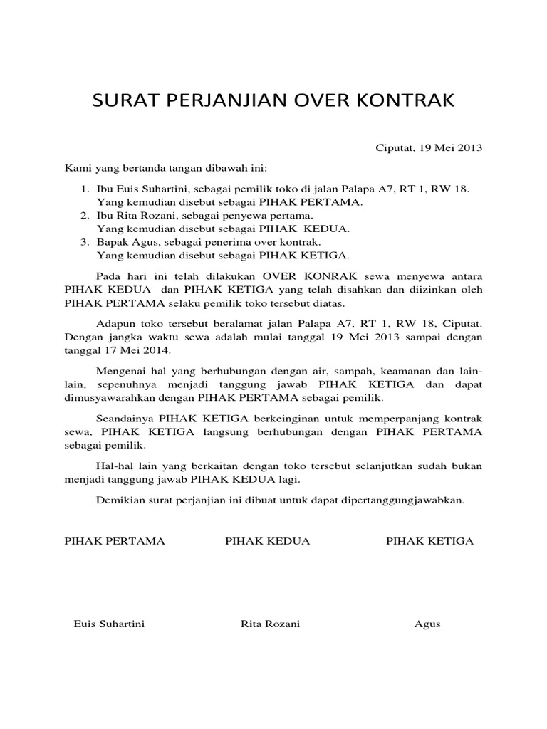 Perjanjian tersebut tentunya dibuat seadil mungkin dan disetujui oleh kedua belah pihak yaitu pihak penyewa dan pihak pemilik rumah. Demikianlah surat perjanjian kontrak atas rumah milik bapak amir komarudin, yang ditulis dengan sebenarnya tanpa paksaan dari pihak manapun. Pada hari ini, tanggal (tanggal, bulan, tahun), kami yang bertanda tangan di bawah ini 2.