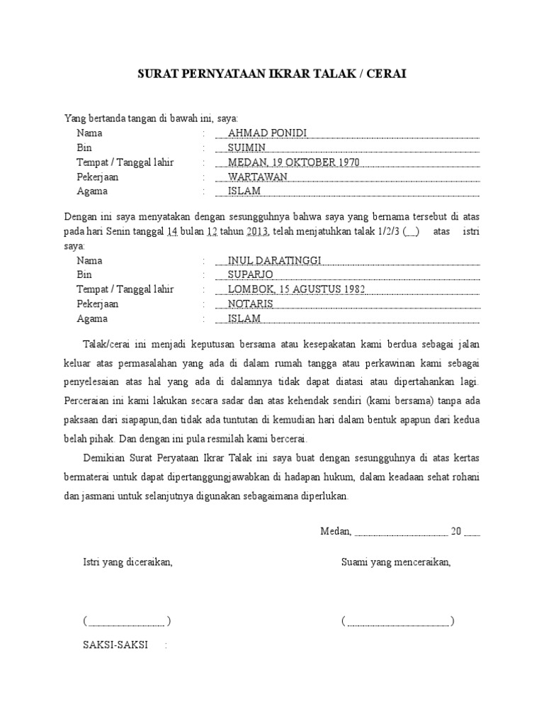 Contoh surat cerai talak suami dan istri beserta formatnya. Contoh surat talak 1/2/3 ini juga dapat digunakan untuk mengurus keterangan cerai ke pengadilan agama. Kemudian, dalam surat talaq cerai juga akan dipaparkan beberapa kesepakatan misalnya kesepakatan untuk tidak menuntut satu sama lain dan demikian surat pernyataan ikrar talak ini saya buat dengan sesungguhnya di atas kertas bermaterai cukup untuk dapat dipertanggungjawabkan di muka.