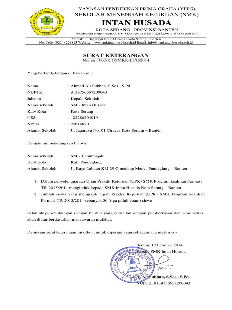 Izin operasional satuan pendidikan kerja sama (spk) (7) selain memenuhi pemenuhan komitmen izin operasional sebagaimana dimaksud pada ayat (4) pendirian sekolah menengah kejuruan (smk) harus memenuhi komitmen. Contoh surat izin yang pertama adalah surat izin untuk tidak masuk sekolah. Dengan hormat, saya yang bertandatangan dibawah ini adalah orang tua/wali dari: