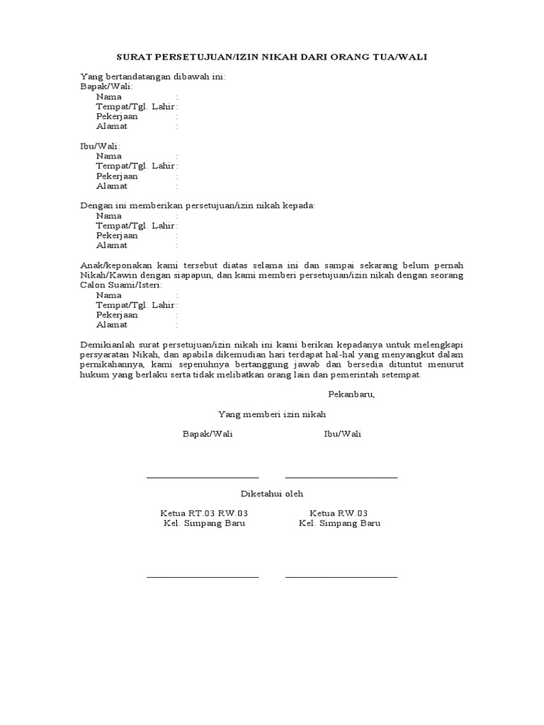 Dengan datangnya surat ini kami memberitahukan bahwa anak kami tidak bisa mengikuti pelajaran seperti biasa di karenakan sedang ada acara keluarga yaitu sedang mengikuti akad nikah keponakannya. Surat izin dari pengadilan apabila tidak ada izin dari orangtua/wali. Surat kuasa wali nikah berwakil dari gopur. N5 (surat izin orang tua) bila secara agama , wali nikah seorang wanita adalah bapak kandungnya.