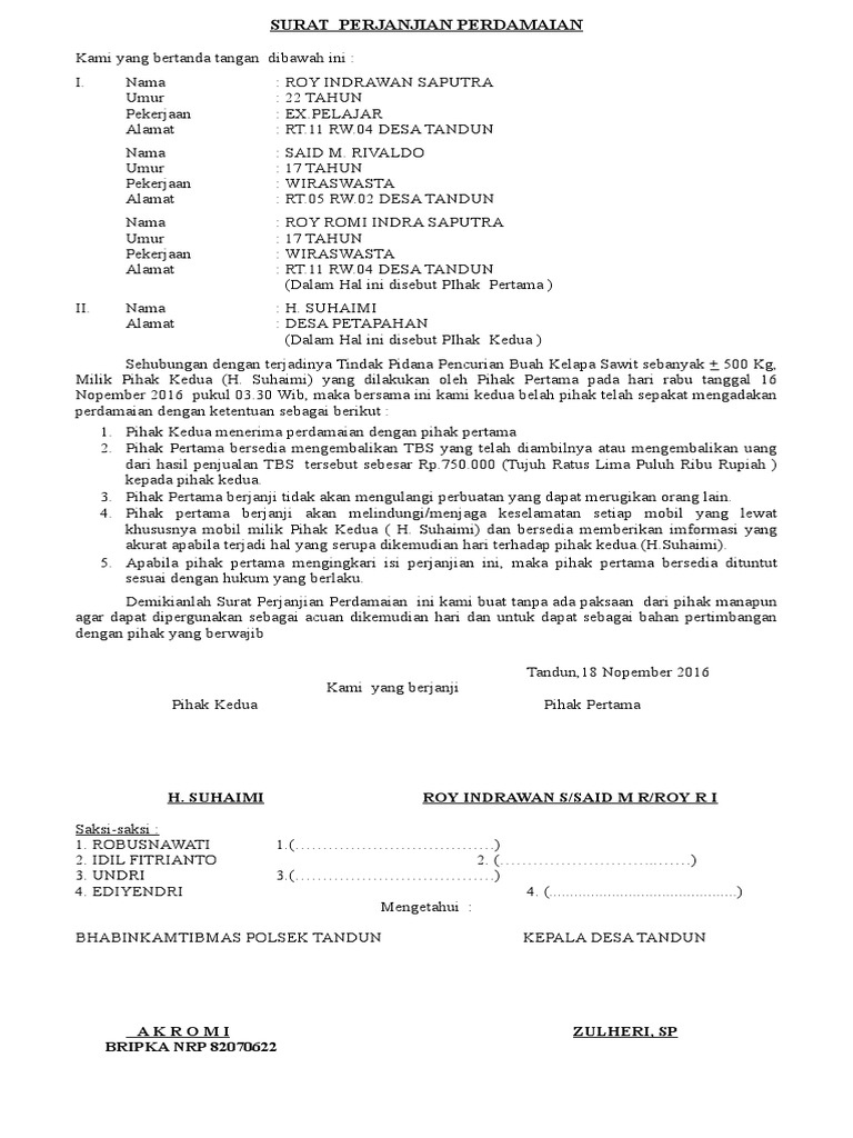 Yang bertanda tangan di bawa ini demikin surat perjanjian perdamaian ini kami buat dalam keadaan sehat dan tanpa paksaan dari pihak manapun dan kami pihak pertama bersama pihak kedua tidak akan melakukan perbuatan tersebut dan bersedia dituntut sesuai.