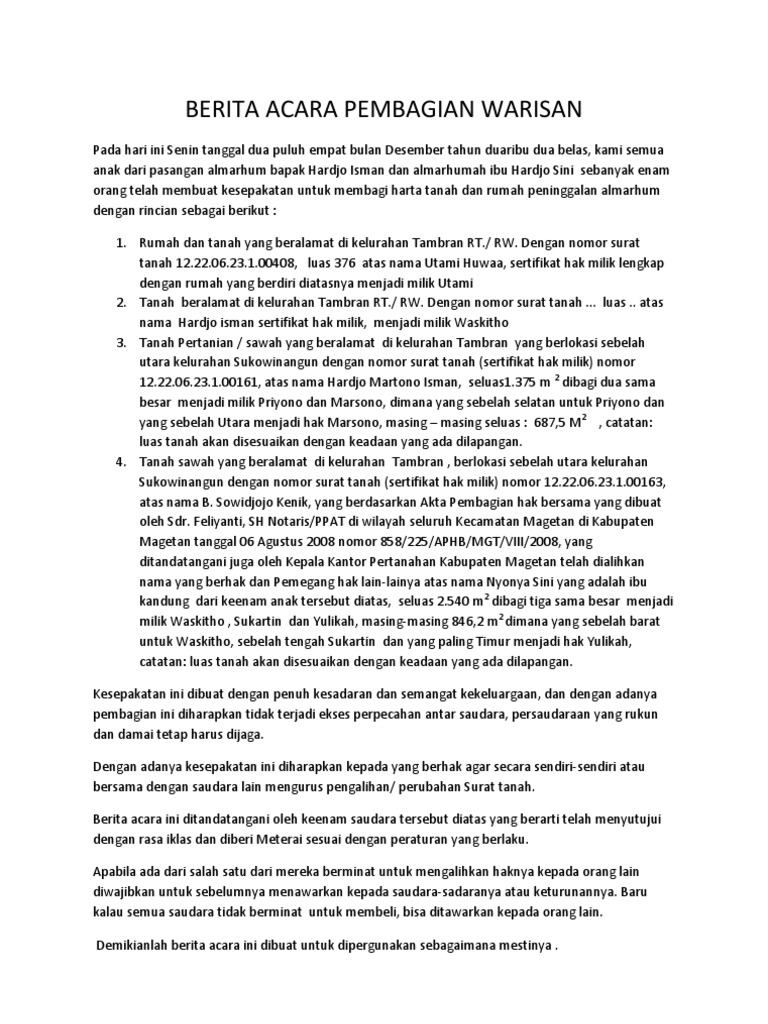 Download Surat Perjanjian Pembagian Tanah Warisan Gif. Apakah anda sudah tahu cara membuatnya? Aset dan properti tanah terkadang didapat dari warisan keluarga atau orang tua yang telah meninggal atau yang telah diberikan kepada ahli waris.