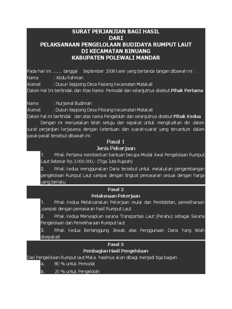 Get Contoh Surat Perjanjian Bagi Hasil Usaha Rumah Makan Images. Surat perjanjian kerjasama merupakan salah satu jenis surat resmi yang mengikat untuk pembagian atas hasil usaha yang dibiayai dengan kredit atau pembiayaan antara kedua belah pihak yang bersangkutan demi tercapainya kesepakatan yang jelas di awal terbentuknya perjanjian usaha. Dan selanjutnya dihitung setiap bulan.