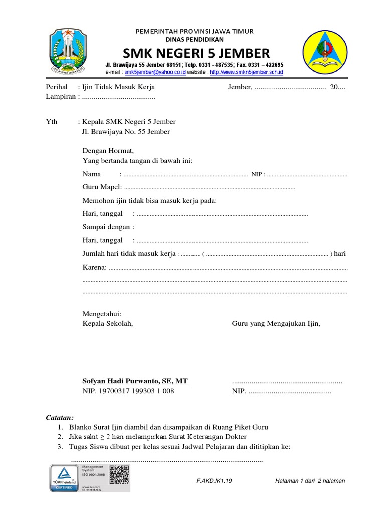 Get Surat Izin Guru Tidak Masuk Kerja Pics. Untuk menghindari hal tersebut, maka seorang guru yang tidak masuk sekolah. Banyak hal yang menjadikan alasan untuk membuat surat izin tidak masuk kerja, seperti ada urusan keluarga yang mendesak atau karena izin sakit dan kali ini kami akan memberikan beberapa contoh surat izin tidak masuk kerja dengan berbagai alasan dan keperluan yang baik dan benar sebagai.