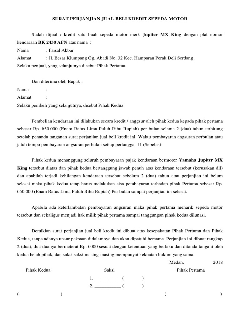Contoh format surat perjanjian jual beli sepeda motor. Fungsi surat perjanjian untuk menjelaskan kewajiban dan hak kedua belah 1. Surat perjanjian jualbeli sepeda motor by operator warnet v.