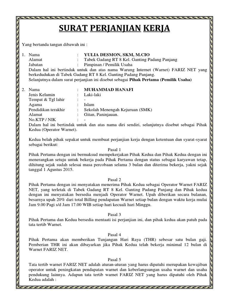Pada hari ini, kamis tanggal dua bulan agustus, tahun dua ribu delapan belas (2 agustus 2018) bertempat di kota bandung, telah ditandatangani perjanjian kerjasama antara Contoh format surat kali ini akan membahas mengenai surat perjanjian kerja pengadaan seragam sekolah. Dengan adanya surat perjanjian kerja ini mengupayakan untuk bisa menghindari berbagai perselisihan yang kemungkinan bisa saja timbul di suatu hari nanti, dan sebagai acuan untuk menyelesaikan perselisihan maupun perkara yang kemungkinan akan datang karena diakibatkan oleh.