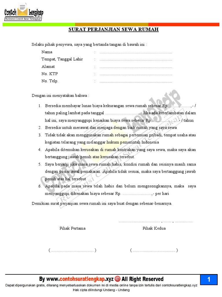 Pictures. Ketika melakukan perjanjian kontrak rumah dengan seseorang, maka anda sebagai pengontrak ataupun pemilik rumah bisa membuat surat perjanjian kontrak rumah. Tempelkan materai 6000 di tengah tengah antara pihak pertama dan kedua kemudian bubuhi tanda tangan dan kedua tanda tangan.