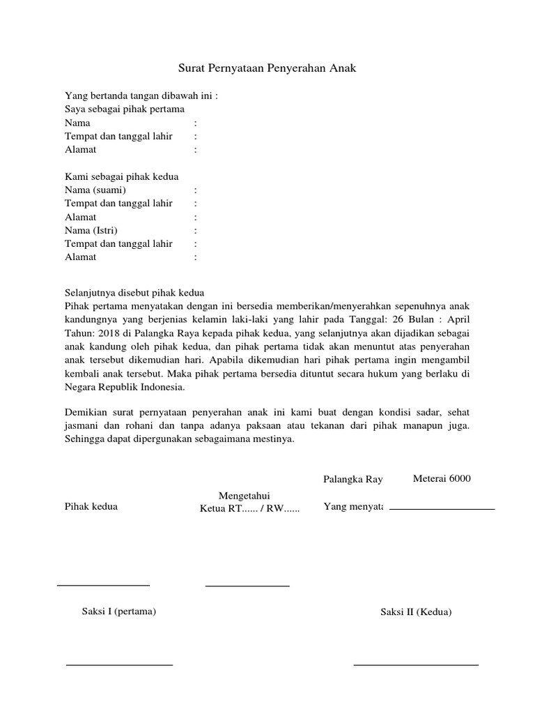 Tujuan & manfaat dari surat pernyataan adalah sebagai penjamin kepastian hokum. Berikut adalah contoh surat perjanjian yang baik dan benar meliputi surat perjanjian jual beli tanah, perjanjian sewa rumah dan perjanjian usaha. Sejak ditandatanganinya surat perjanjian ini maka tanah tersebut di. Yang bertanda tangan di bawah ini kami pasangan suami istri yang disertai penyerahan hak dan tanggung jawab anak tersebut kepada pihak kedua, yang selanjutnya agar dapat diangkat sebagai anak pihak kedua.